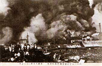 1923年(大正12年)9月1日11時58分関東地方南部を大地震が襲った。最大震度7、マグニチュード7.9であった。今年10月の新潟中越地震は震度6強、マグニチュード7と言われる。新潟の地震は死者39人、避難した人10万人といわれる。山間部での被害が目立つ地震であった。関東大震災は東京横浜の大都市が中心であったので大被害が出た。地震が起きたのは、ちょうど昼食前で食事の煮炊きの火を使う時刻であったから、倒壊した家屋から出火した。記録によると、東京だけで134カ所から火災が発生したと言われ、この火災は9月3日昼過ぎまで丸3日延焼を続けようやく鎮火した。阪神・淡路大震災のときもそうであったが、大地震+大火災で被害は大きくなった。