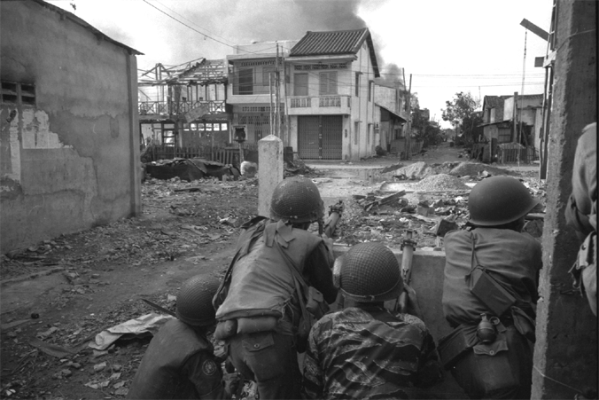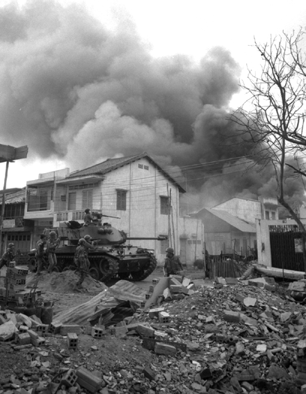 やがて、ごうごうと音が響いて南ベトナム政府軍の戦車と歩兵部隊の兵士が背後の通りから現れた。解放軍のいる家の方角に向かって戦車砲を打ち始める。避難していた家の人に礼を言っておもてに出た。戦車の後を歩く兵士たちの後について写真を撮り始めた。