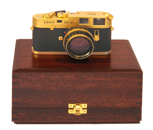 ゴールデン・ライカはM4-2型である。ライセンスにはこのライカはライカの設計者であるオスカーバルナックの生誕100年記念として発売されるもので、24金のブレードを使用して作られ革張りの部分には特別製のトカゲの皮を使用。特別シリアル・ナンバーは。No100-0545 通常の製造ナンバーは1528182と書いてある。