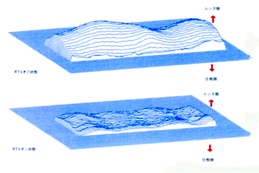 (2)RTSIIIのカタログに掲載されているRTV(リアルバキューム)メカニズムの説明イラスト。左が真空装置が作動していないフィルム圧板。右が真空装置が働いているときの圧板の状態