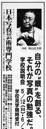 秋山さんは温顔であった。気持ちの上では厳しいところがあらられただろうが、顔に表れることはなかった。追悼会で飾られた秋山さんの写真も穏やかでいい顔の写真であった。掲載した写真はアサヒカメラに載っている写真学校の広告だ。大変に厳しい顔で写っている珍しい写真だ。秋山さんは写真学校の広告塔の役割を買っておられた。