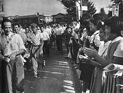 写真は1958年昭和33年日教組の勤務評定反対闘争での先生方のデモ行進。デモ隊に出会った下校の中学生たちが「あら先生よ」と声援していた。このころフェニドン現像液を使ったいたようで、いま写真を見ると粒子の粗さに驚いてしまう。